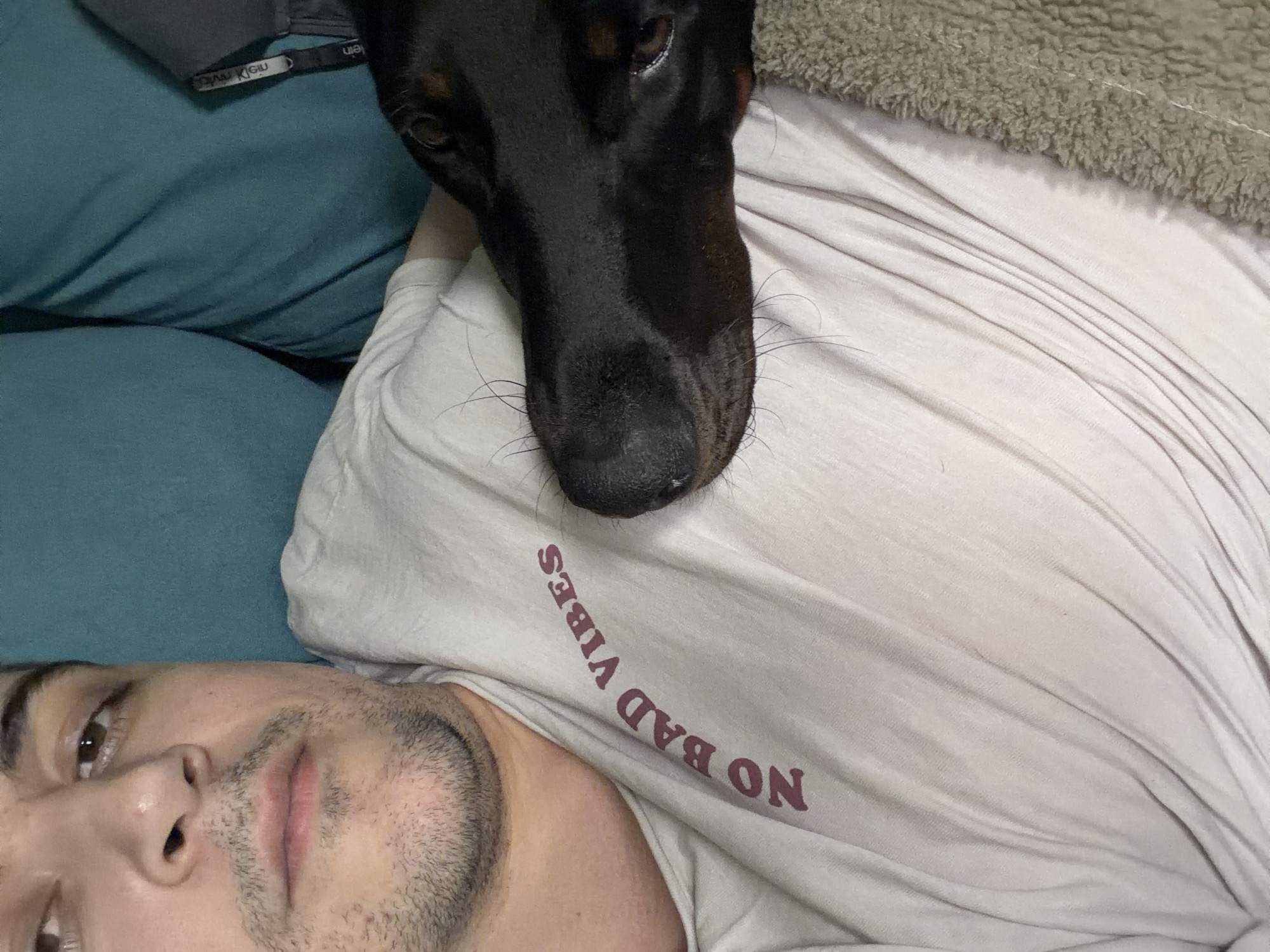 A man is lying on his back, wearing a light-colored t-shirt with the text "NO BAD VIBES" printed in maroon lettering. A black Doberman Pinscher's head rests on the man's chest. The man's face is visible, with a light beard. The scene appears to be indoors, on a bed or couch, based on the blue cushion and grey textured surface in the background. There is no indication of Sofia, Bulgaria.