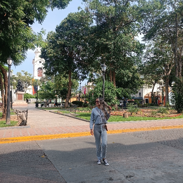 A woman in a grey sweat suit stands in a plaza on a sunny day. Cobblestone paving is visible, divided by a yellow line. Tall trees surround the open area, providing shade. In the background, a white building with a clock tower rises. A statue and flags are also visible in the plaza, along with park benches and lampposts. The woman is smiling and her hair is long and wavy.