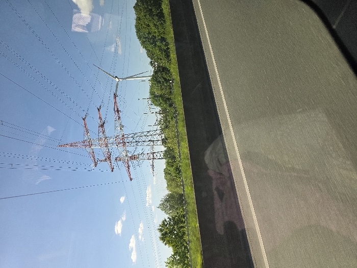 view from a vehicle traveling on a highway in Münster, Germany, at the coordinates 51.969, 7.547. Two red and white power lines intersect the roadway, and a single wind turbine, painted white, is visible on the right side of the image, with its blades stationary. Lush greenery, likely trees, is visible at the far end of the road. The scene is captured on a bright, sunny day, with a clear blue sky featuring thin, wispy clouds. The sun is not directly visible but is assumed to be shining brightly. The image is taken from a perspective inside a vehicle, likely the passenger seat, with the view obstructed by the window's reflection. A dark, gray asphalt roadway, a highway, is visible in the foreground. The image is slightly blurred, and the colors are slightly desaturated. The picture appears to be taken from a moving vehicle, possibly a car or bus. The overall image is one of motion and transport.