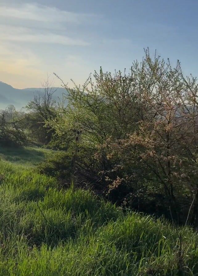 The video begins with a view of a grassy hillside bathed in the light of a rising sun