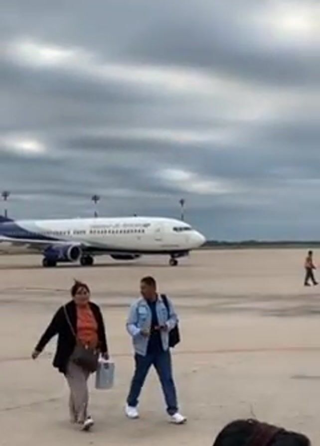 BoA Boeing 737 on an airport tarmac. A man and a woman are walking by the plane, and another person’s head is visible in the foreground. The sky is overcast. The plane has "Boliviana de Aviacion" written on it. A man is visible standing near the plane.