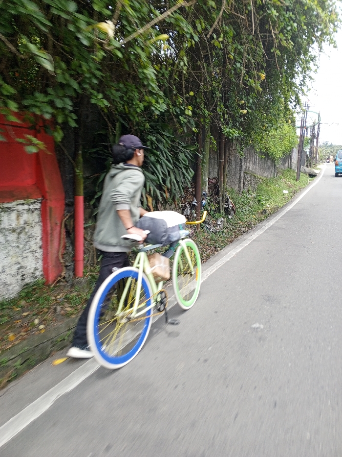 The image captures a roadside scene in Cisarua, Indonesia. A male individual is depicted from a rear-left perspective, walking alongside and pushing a bicycle forward on an asphalt road. He wears a dark blue baseball cap, white earphones, a light olive-green hoodie, dark trousers, and white sneakers. The bicycle features a light green frame, a white seat, yellow drop handlebars, and pedals. Its front wheel has a blue rim with a white sidewall and yellow spokes, while the rear wheel has a lime green rim and yellow spokes. A grey cylindrical object is secured below the seat, and a light brown rectangular object is attached to the frame above the pedal. The individual and bicycle are positioned on the far left of the road, adjacent to a white solid line marking the road's edge. To their immediate left is a narrow strip of ground with sparse vegetation, bordered by a concrete wall heavily overgrown with dense green foliage, including large-leafed plants and tree branches. A red and white painted structure is partially visible on the far left. Scattered debris is present at the base of the wall. Further down the road, utility poles with wires are visible. In the distance on the right side of the road, a blue vehicle is partially observable. The overall scene suggests a daytime setting with ambient lighting.
