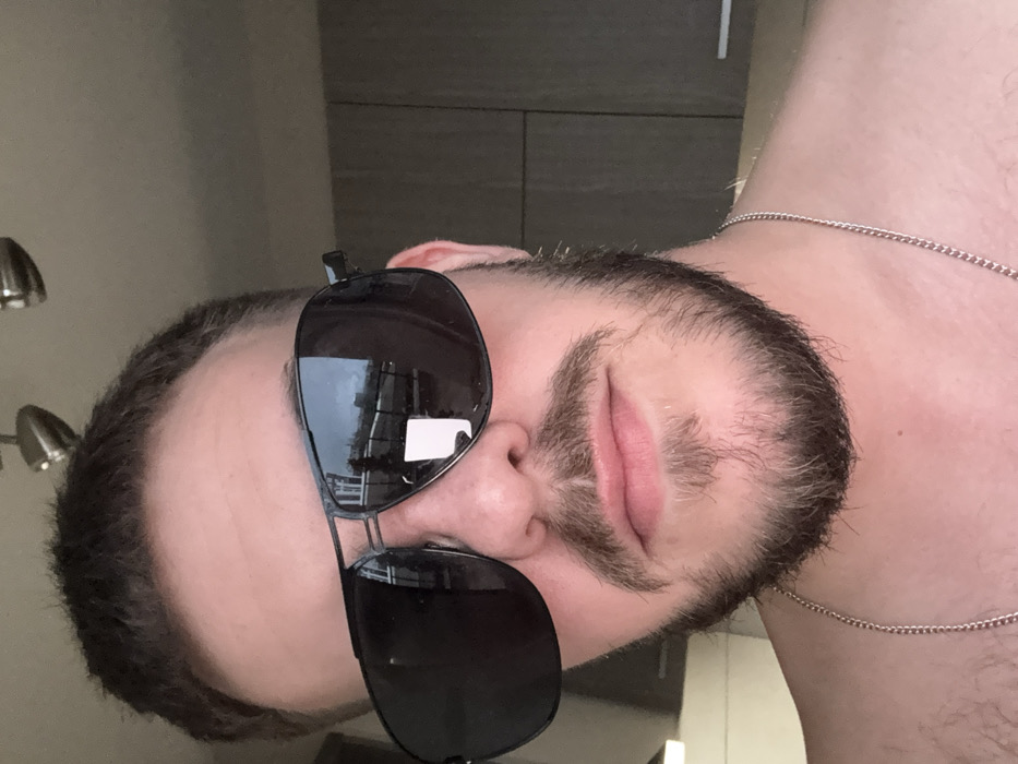 A close-up, chest-up image shows a male individual with short dark hair and a full, dark beard and mustache, featuring some lighter hair around the chin area