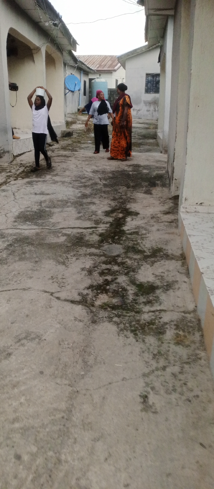 The image captures an alleyway in Lokoja, Nigeria, under an overcast sky. The ground is a cracked concrete surface exhibiting widespread dark green and black discoloration, consistent with moss or moisture. The scene features three females. In the foreground on the left, a young female, dressed in a white short-sleeved top and dark trousers, balances a white cylindrical container on her head, supporting it with both hands raised. She appears to be walking. Mid-ground, a second female wears a light gray short-sleeved top, dark trousers, a pink headscarf, and a black scarf around her neck. She stands facing right. Adjacent to her and slightly behind, a third female, adorned in an orange and dark brown patterned long dress and a dark headscarf, stands facing left. The second and third females appear to be engaging in conversation. The alley is flanked by light-colored, single-story buildings. The building on the left features an arched recessed entry and a wall-mounted electrical component. A blue satellite dish is visible on a wall further into the alley on this side, with a large light blue cylindrical water tank partially obscured behind it. The building on the right has a facade with a striped base of alternating light and dark rectangular blocks. A window with security bars is visible on this building further back. Corrugated metal roofs are visible on structures in the background. Sparse, dry vegetation is visible between some buildings.