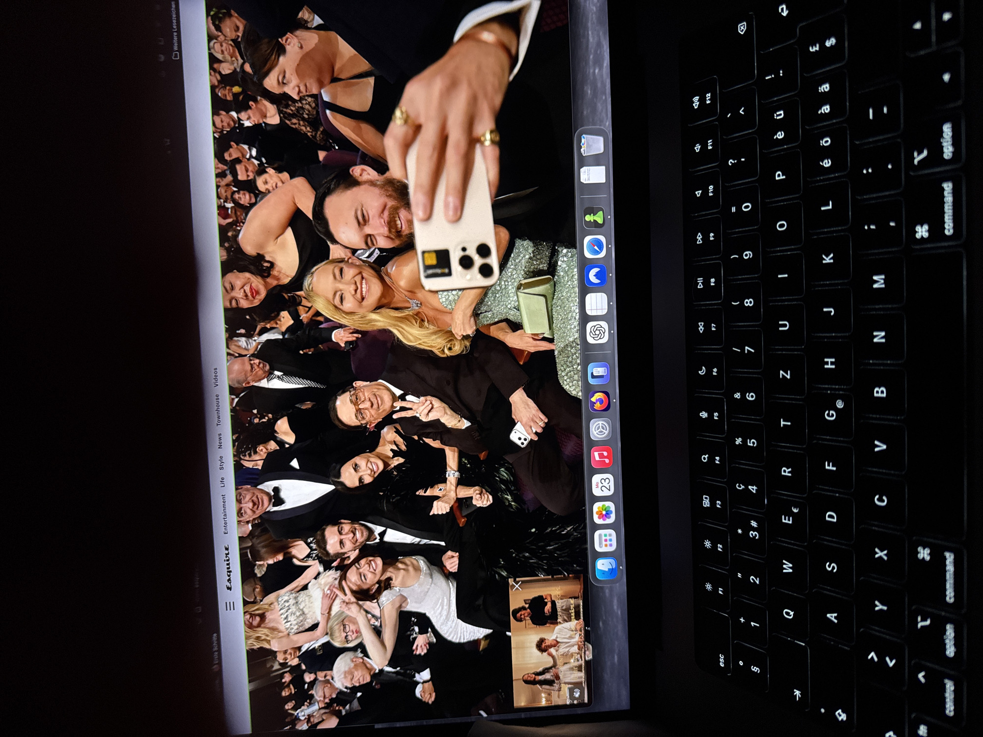 The image captures a MacBook laptop in a dimly lit indoor setting, located in Willisau, Switzerland. The laptop screen displays the "Esquire" magazine website, featuring a prominent photograph of multiple well-dressed celebrities at a formal event, likely an awards ceremony or gala. In the celebrity photograph, notable figures include Kate Hudson and Danny Fujikawa taking a selfie with a light-colored iPhone 15 Pro Max, as well as Demi Moore, Zachary Levi, and Timothy Olyphant (making a peace sign while holding a phone) smiling and interacting. The individuals are seated in rows of dark, possibly purple, upholstered chairs. A small picture-in-picture video window is active in the lower-left of the screen, showing three young individuals. Below the main content, the macOS dock is visible, displaying application icons and the date "Mo 23". The laptop's QWERTZ keyboard is illuminated with white backlighting against black keys, indicating an active display in a low-light environment.