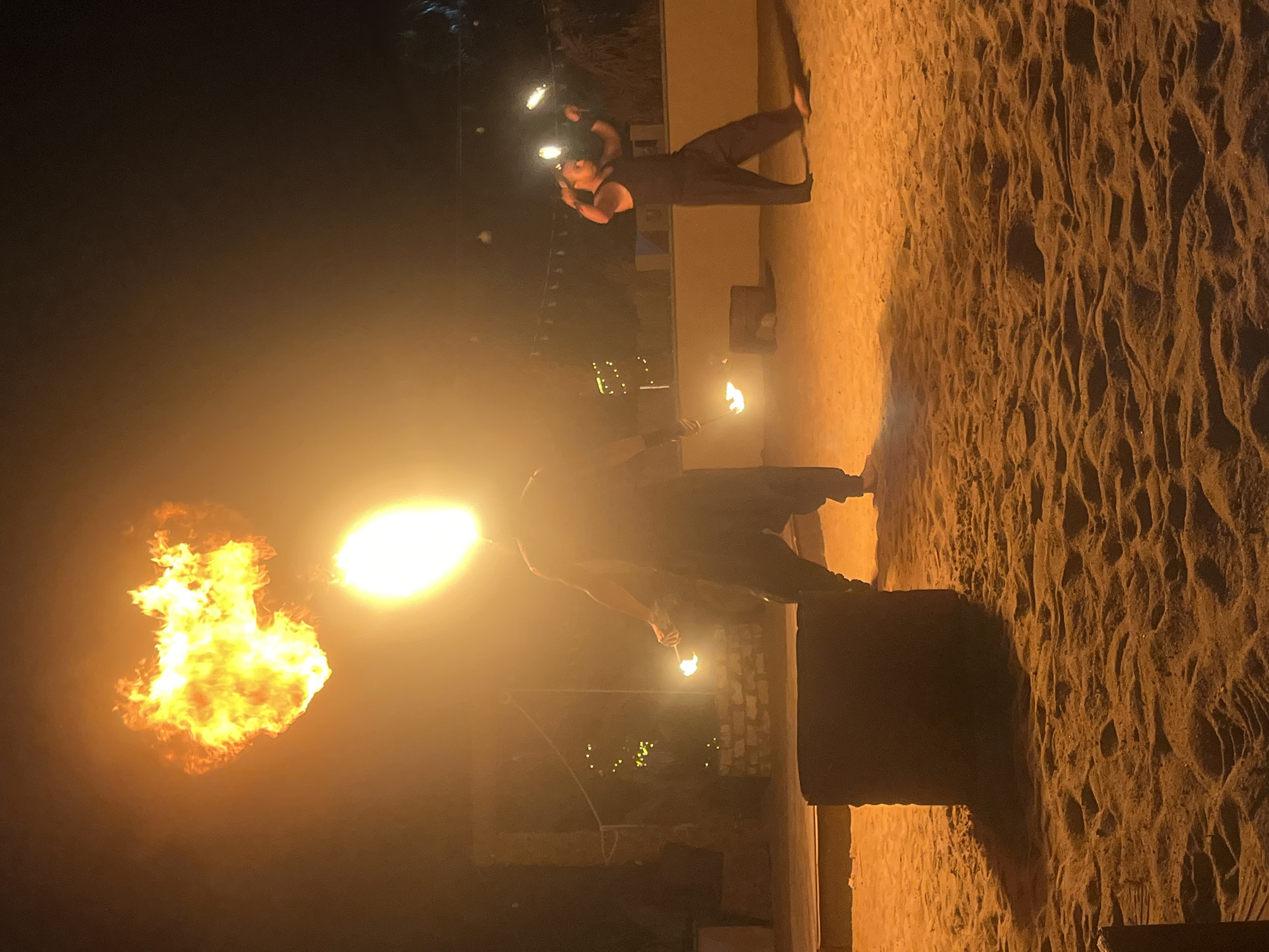 A brightly illuminated scene shows a person blowing fire, creating a large burst of flames emanating from their mouth. They are standing on a sandy surface, possibly a beach, with another person juggling fire behind them. The location is Unknown, Egypt, based on the provided information. The environment is dark, save for the artificial lighting highlighting the performers and the sand.