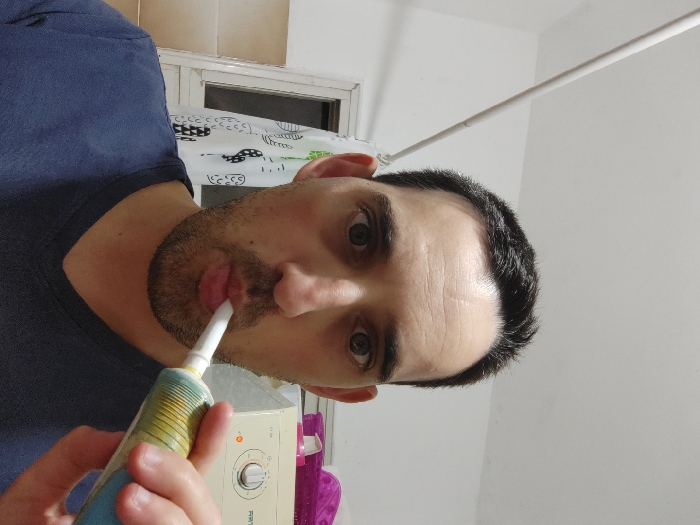 - "A man in a blue shirt is captured at a tilted angle, focusing on his face as he brushes his teeth with an electric toothbrush" by FM-3Ip2o1, licensed under CC BY 4.0