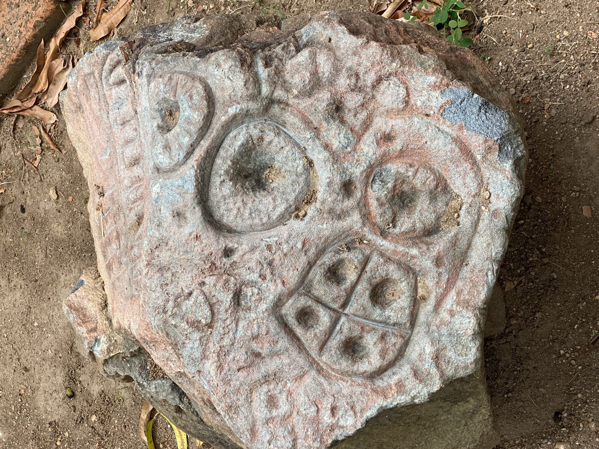 large, weathered rock found on the ground in Tinaquillo, Venezuela. The rock surface has several carved figures, including two circles with smaller concentric circles, a shape that resembles a heart and a square divided into four quadrants. The rock sits on dirt ground mixed with small stones, leaf debris, and other natural elements. The general color scheme is various shades of gray and brown with reddish areas of the stone showing through the dirt and grime.