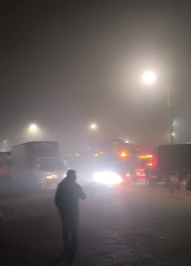 very foggy scene, likely at night. Several trucks and cars are present, illuminated by their headlights and streetlights, which create a bright glare through the fog. Several people are visible, some standing near the vehicles and others walking. One person in the foreground is walking toward the vehicles, and another person can be seen in the bottom right corner of the frame. The ground appears to be pavement or a similar hard surface.