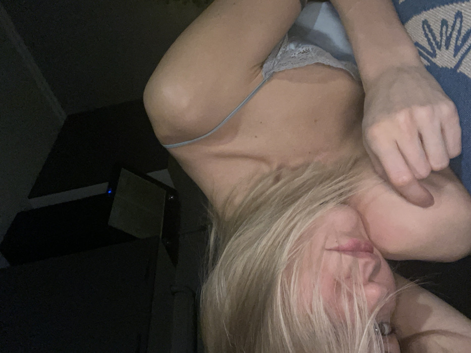 A woman with blonde hair is visible in the image. She is lying down. She is wearing a blue garment with lace trim. Her face is partially obscured by her hair. A hand is positioned near her face. The background features a dark area and a blue patterned surface.