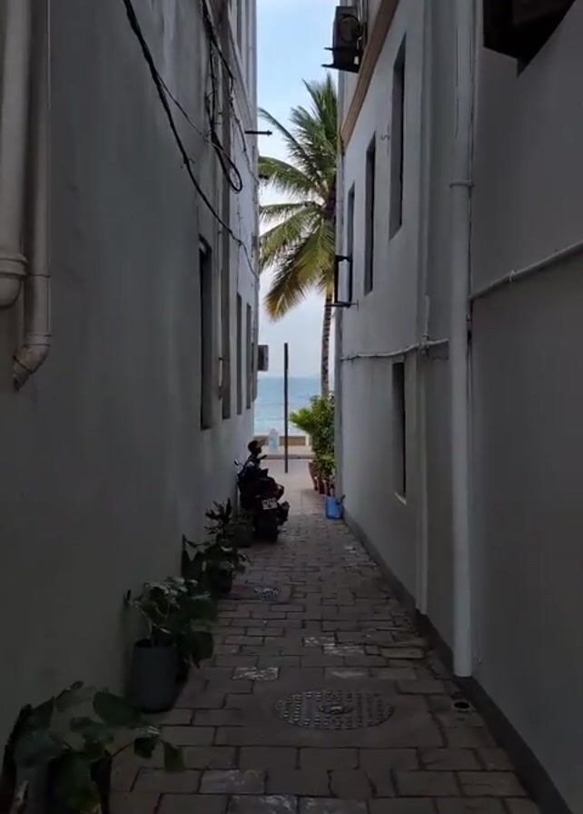 narrow alleyway lined with white buildings. The alley is paved with brick and has potted plants lining the sides. At the end of the alley, the ocean and a palm tree can be seen. A motorcycle is parked on the left side of the alley. There is a person sitting on a bench or wall by the water. The sky is light blue.