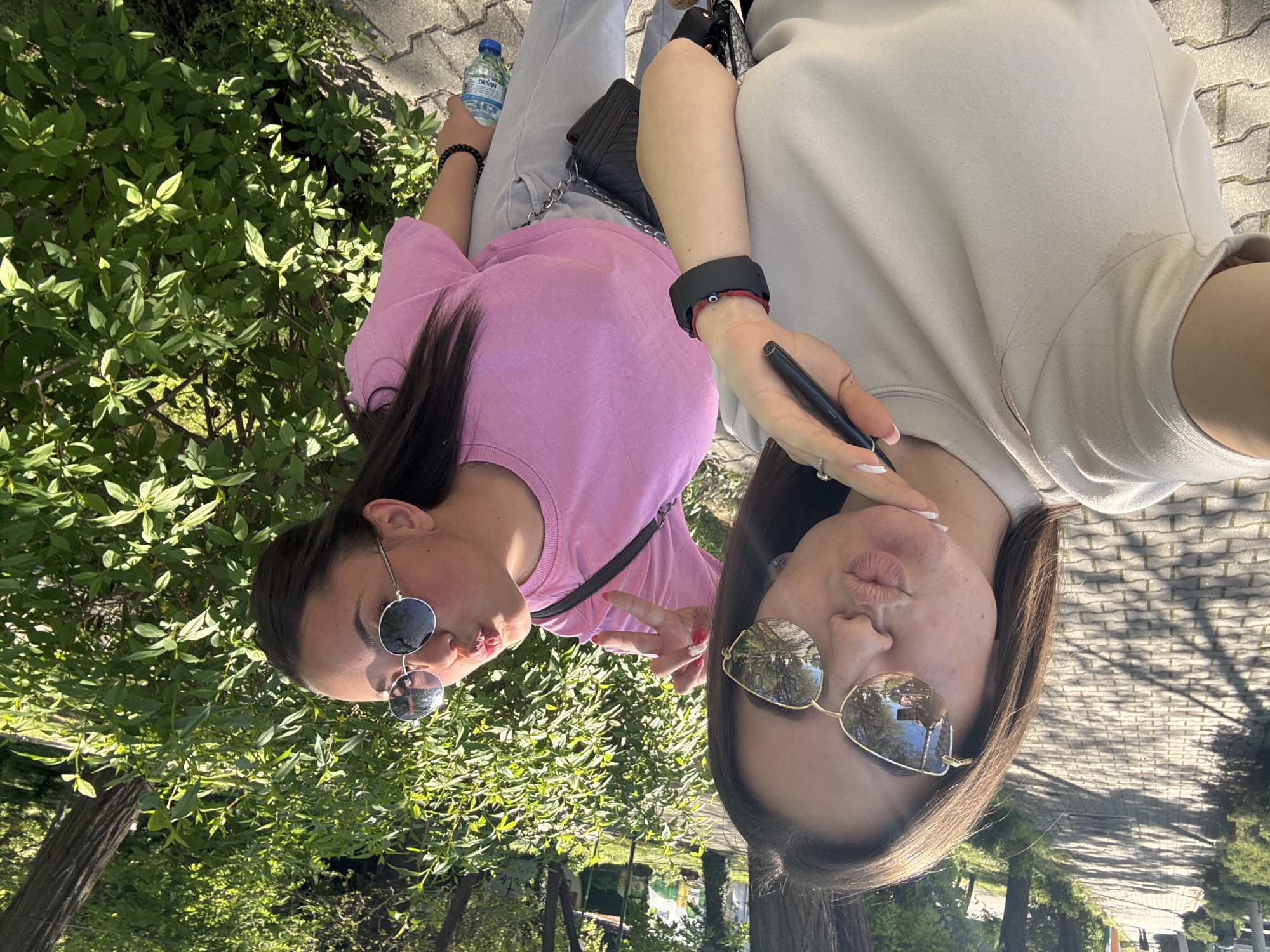 Two young women are posing for a photograph in an outdoor setting. One woman is wearing a pink t-shirt and light-colored jeans, holding a water bottle in her left hand and making a peace sign with her right hand. The other woman is wearing a light-colored sweatshirt, holding a black pen or stylus in her right hand. Both women are wearing sunglasses. They are standing on a paved surface, possibly a sidewalk or path, with trees and greenery in the background. Based on the water bottle, the location is likely Chirpan, Bulgaria.