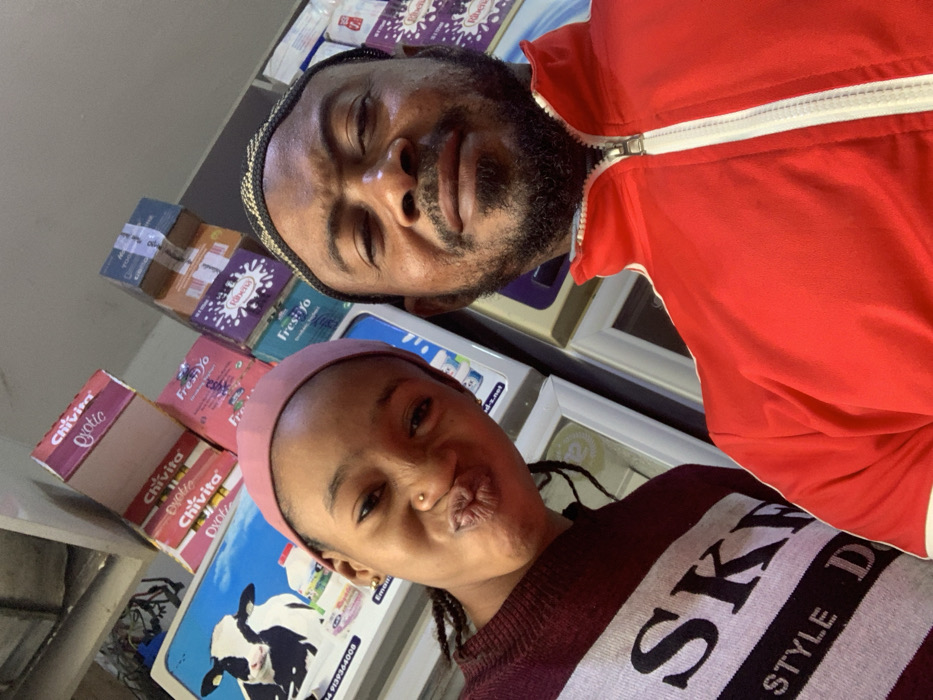 Two individuals, one female and one male, are captured in a close-up, upward-angled photograph within an indoor retail environment, consistent with a mini-mart or convenience store in Aviation Quarters, Nigeria