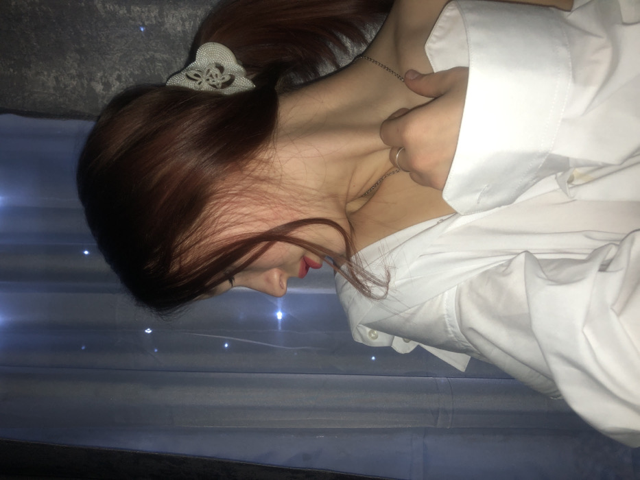 A woman with red hair is wearing a white collared shirt. Her hair is styled in a ponytail, secured with a decorative hair tie. She is wearing a delicate silver necklace. Her lips are painted red. The background shows a soft, possibly light-lit, fabric. A hand rests on her collarbone, obscuring part of her neckline. The image is oriented sideways.
