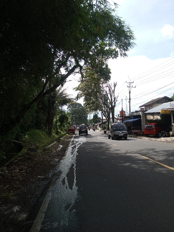 This scene is located in the city of Domphoog_Dungkarchhoeling, Bhutan. The image presents a daytime, eye-level perspective of a paved, two-lane asphalt road extending into the distance under a partly cloudy sky. The left side of the road features a dark, wet shoulder with visible water runoff and debris, bordering a narrow drainage ditch. Beyond the ditch, a densely vegetated embankment rises, dominated by tall bamboo and other broadleaf trees, some with visible trunks and branches covered in moss or vines. Utility poles with multiple overhead wires run along this heavily treed left side. A red pickup truck is parked on the left shoulder in the midground, facing away from the viewer. The right side of the road is lined with buildings and utility infrastructure. A black light-duty truck or minivan is positioned in the right lane, facing the viewer. Further down the road, a dark SUV is observed moving away from the viewer. A red compact car is parked on the far right shoulder. Buildings along this side include single and two-story structures, with one in the midground featuring a corrugated metal roof and an open storefront displaying a "WARUNG" sign. Utility poles with numerous power lines are prominent on this side. The road itself is dark asphalt. A solid white line marks the left edge of the paved surface, separating it from the wet shoulder. Yellow double solid lines are visible in the distance. Shadows from overhead trees are cast across the road's surface in the foreground and midground. No identifiable individuals are clearly visible in the scene.