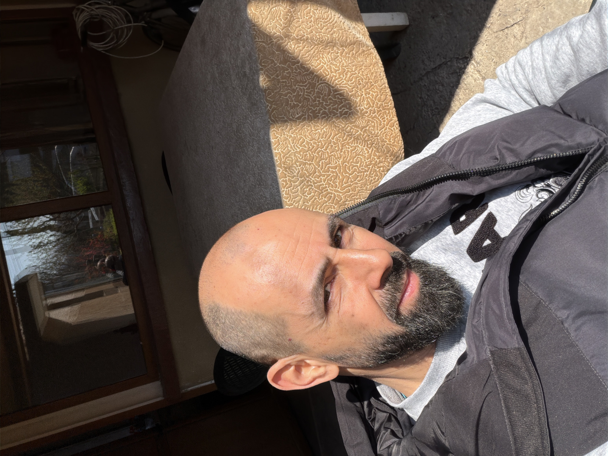 A bald man with a beard is wearing a grey sweatshirt and a black jacket. He is outdoors, with a patterned object or surface to his left. Part of a window with a reflection is visible in the background. The location in the city of Kutovo, Bulgaria is not explicitly stated and is not possible to determine from the image.