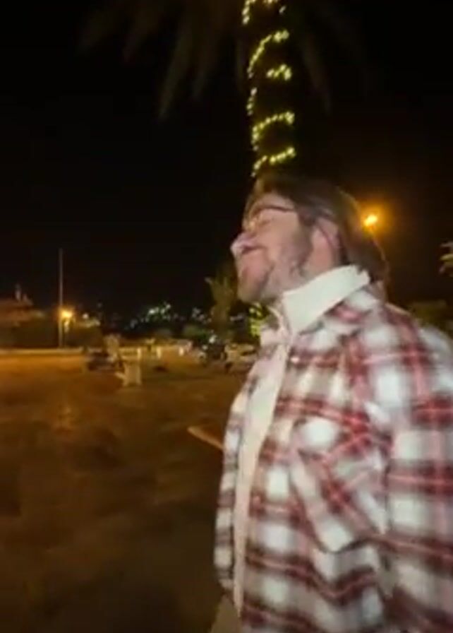 The video begins at night with a man in a red and white plaid jacket, a white turtleneck, and glasses looking up at a palm tree decorated with Christmas lights