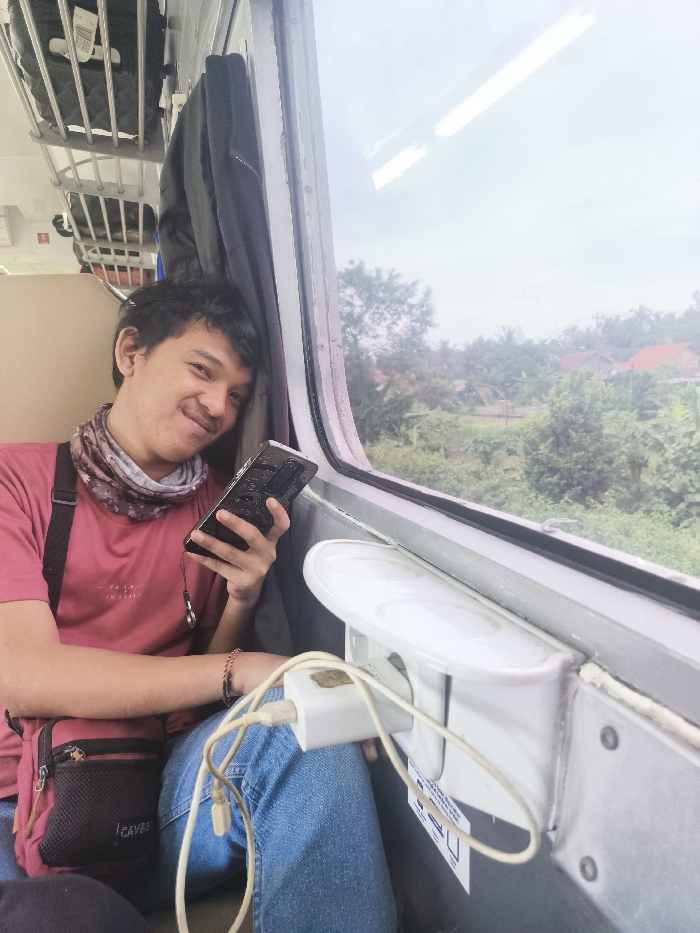 - "The image depicts a male individual seated inside a passenger train, reportedly traveling through the vicinity of Nusajati, Indonesia" by FM-x3nfq1, licensed under CC BY 4.0