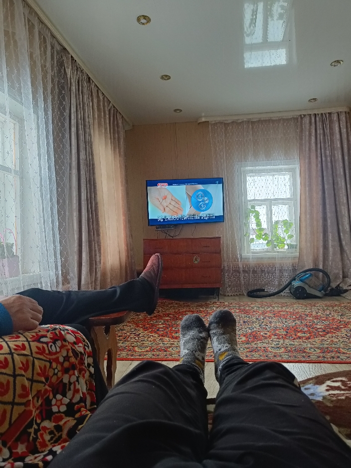An interior scene depicts a domestic setting in Nizhnii Bugrysh, Russia, observed from a low vantage point. In the immediate foreground, the legs of one individual are extended, clad in black pants and gray patterned socks. To the left, the lower legs of a second individual are extended and rest on a small wooden stool, wearing dark pants and a single dark red slipper. A patterned blanket covers the second individual's lap. A flat-screen television is mounted on a light brown wall in the mid-ground, displaying a medical or pharmaceutical advertisement that includes an image of a hand holding an orange pill and a cellular diagram, with accompanying foreign text. Beneath the television is a dark brown wooden dresser with three drawers. To the right of the dresser, a window with sheer white lace curtains and heavier brown opaque curtains is visible, revealing a potted plant on its sill. Another similarly curtained window is partially visible on the far left. The white ceiling features four recessed spotlights and reflects the room's windows. The floor is covered by a red and black patterned rug. A blue and gray canister vacuum cleaner is positioned on the rug to the right of the dresser.