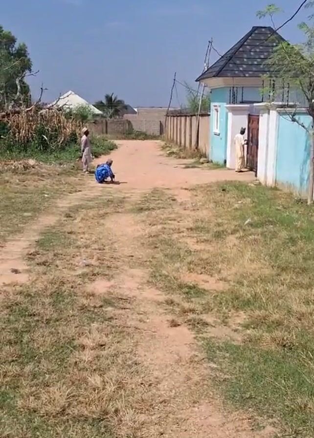 dirt road in a village setting. There are three individuals. One person is standing near a cornfield, another is squatting in the road, and a third is entering a gate. The gate leads to a house with a blue and white exterior. A concrete wall surrounds the house. The landscape is dry with sparse vegetation. The sky is clear and blue.