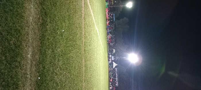 The image displays a nighttime scene at a sports stadium in Nairobi, Kenya. The foreground consists of a vibrant green grass field, presumably a football pitch, marked with white demarcation lines, including a curved line in the immediate foreground. The field is intensely illuminated by two prominent floodlights on tall poles, one to the left and another centrally located to the right, casting bright light and creating lens flares against a dark night sky. In the mid-ground, along the far side of the field, spectator stands are densely populated with numerous individuals appearing to observe an event. Near the field's edge, in front of the stands, a group of personnel, possibly players or officials, are gathered in various colored attire, including red, blue, and green. Adjacent to the stands on the right, two white tents or marquees are visible, one conical and one pyramidal. Nearby, a multi-tiered structure, likely a control tower or camera platform, stands tall, with an individual possibly present on its uppermost level. Colored banners or advertising boards line the front barrier of the spectator area. The overall environment indicates an organized sporting event taking place under artificial lighting.