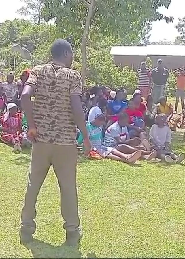 A man in a camouflage t-shirt and brown pants stands facing a large group of people of all ages who are seated on a grassy lawn. Most are seated on the ground, but some are standing at the back of the group. They are outdoors in a rural setting with trees and a small building visible in the background. Some of the people are wearing brightly colored clothing, and some are wearing head coverings. A small wooden fence is in the background with laundry on the clothesline. Two men sit on green chairs, to the left of the speaker. The day appears to be bright and sunny.