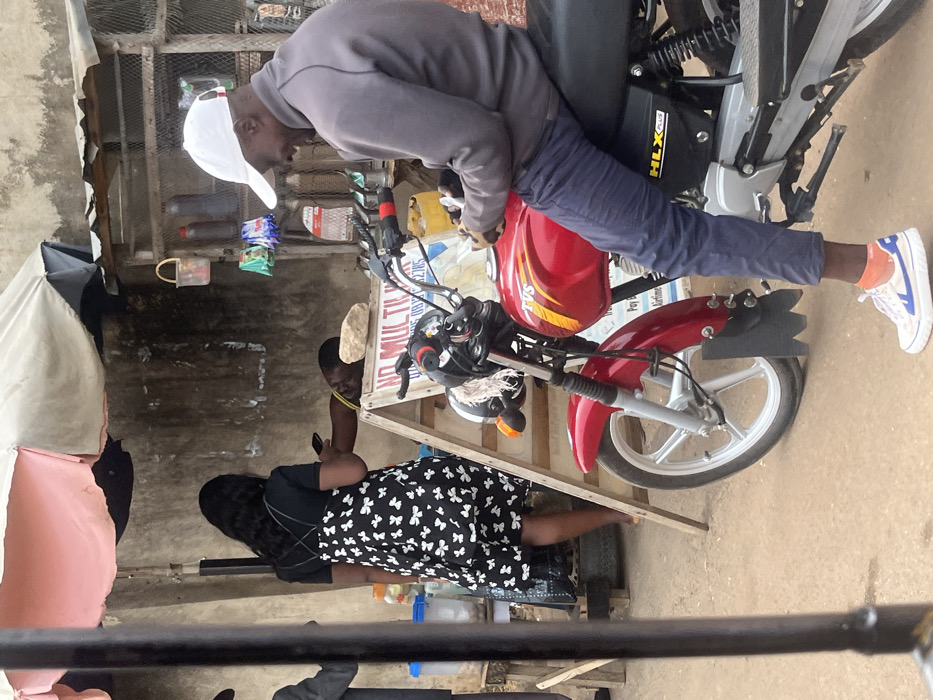 This image depicts a street scene in Narayi, Nigeria. In the foreground, a man sits astride a red TVS HLX Plus motorcycle, facing left. He wears a white baseball cap, a grey long-sleeved shirt, blue trousers, white sneakers with blue accents, and orange socks. He looks down, smiling, at an object in his hands. To the left, a woman with long dark hair, wearing a black top and a black-and-white patterned dress with white bow motifs, stands facing a wooden counter. She holds a dark smartphone horizontally, appearing to interact with a man partially visible behind the counter, who wears a yellow shirt and leans forward. The counter is part of a rustic stall with a corrugated metal roof and wooden framing, covered by a light-colored umbrella. The stall displays various items including bottles, packaged goods, and a yellow bucket. A white sign reading "NO MULTI" and a phone number is visible on the counter. The ground is unpaved, and a large light-colored rock rests on the counter near the man behind it. A partially obscured figure in a dark jacket is visible on the far left.