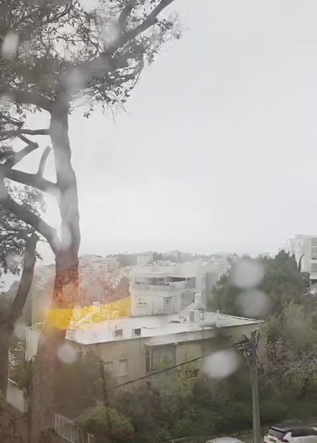 The scene is a view from a window, presumably indoors, showcasing a rainy day