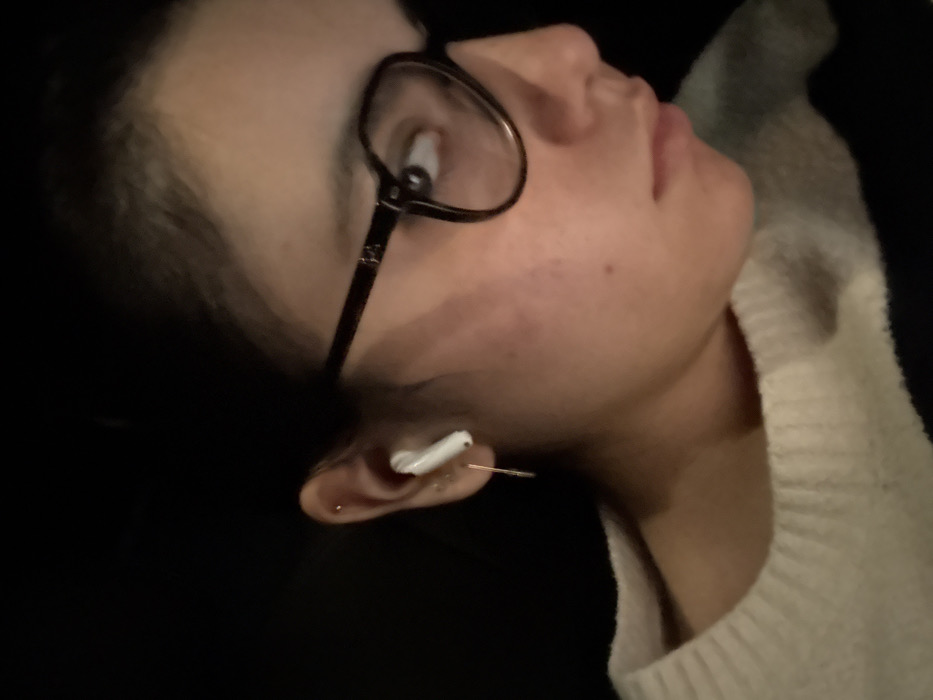 A person with glasses is lying down wearing an earpiece with a thin needle seemingly piercing the ear. The subject has fair skin and dark hair. The person is wearing a cream-colored, knitted sweater. The lighting is dim, casting shadows on the face. The angle is tilted.