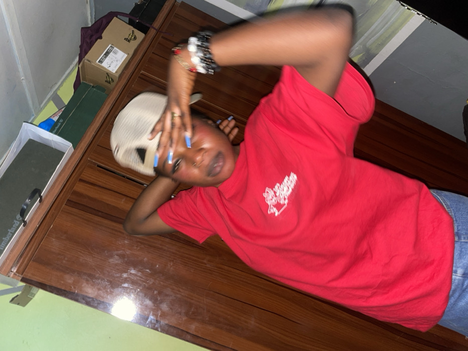 A young woman lies on a wooden surface, wearing a red t-shirt, blue jeans, and a baseball cap. Her left hand is raised to her forehead, adorned with bracelets. She has long, blue fingernails and a nose piercing. To her left, there are shoe boxes. The lighting appears dim, casting shadows across the room. The woman is looking directly into the camera.