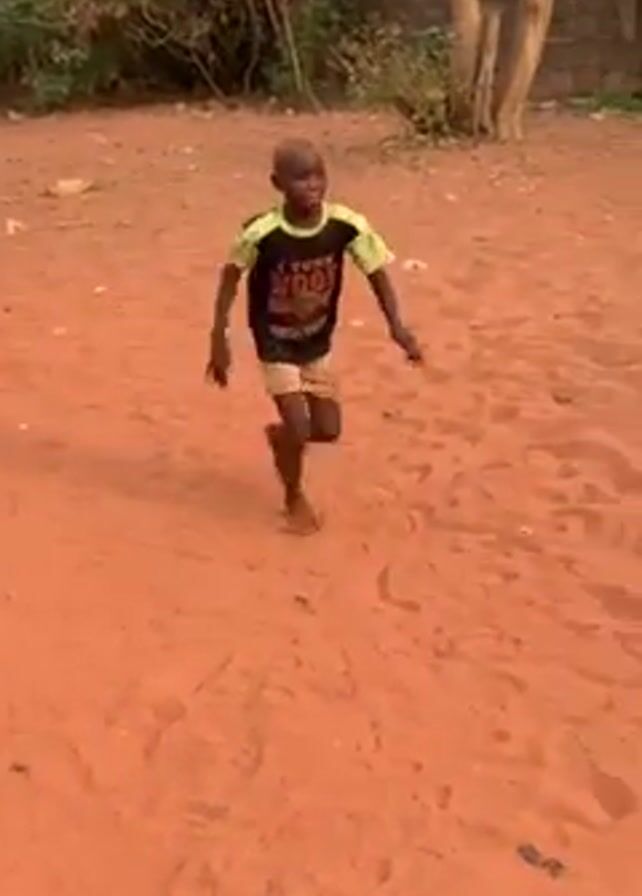 In a low-angle shot, three young boys are engaged in a play activity on a reddish-brown sandy surface. The boy in the foreground is shirtless, wearing olive-green shorts, and has a fair complexion. Another boy, standing slightly farther away, is dressed in a black t-shirt with a colorful design, light-colored shorts, and has dyed blonde hair. The third boy is partially visible on the left side of the frame. The blonde-haired boy is the most active; he is captured extending his arms out to the sides and then arching backward in an acrobatic maneuver. The camera records the scene outdoors, where the surrounding area appears to be a residential or semi-urban setting with vegetation, a brick structure, and a wooden post visible in the background.