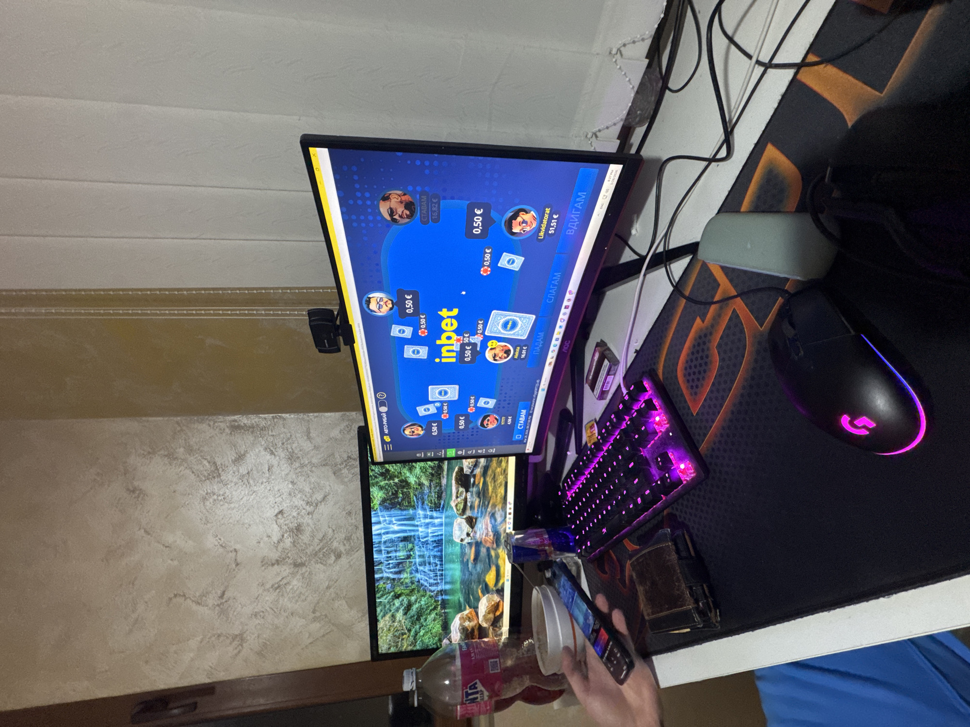 Here is a forensic description of the image: The image shows a cluttered desk setup, likely indoors, with two computer monitors, a keyboard, a mouse, and various other objects. The top monitor displays a poker game interface from "inbet," showing several players and their bets in euros. The bottom monitor shows a waterfall background. A gaming mousepad with an orange flame design is visible under the keyboard and mouse. A hand is holding a smartphone and a disposable cup with a straw. A partially empty Fanta bottle is visible next to the cup. There are numerous cables and wires running behind the monitors. The walls in the background appear to have a textured finish, and the room is illuminated by an unseen light source. There is no evidence in the picture to indicate that this is specifically in the city of Dupnitsa, Bulgaria.