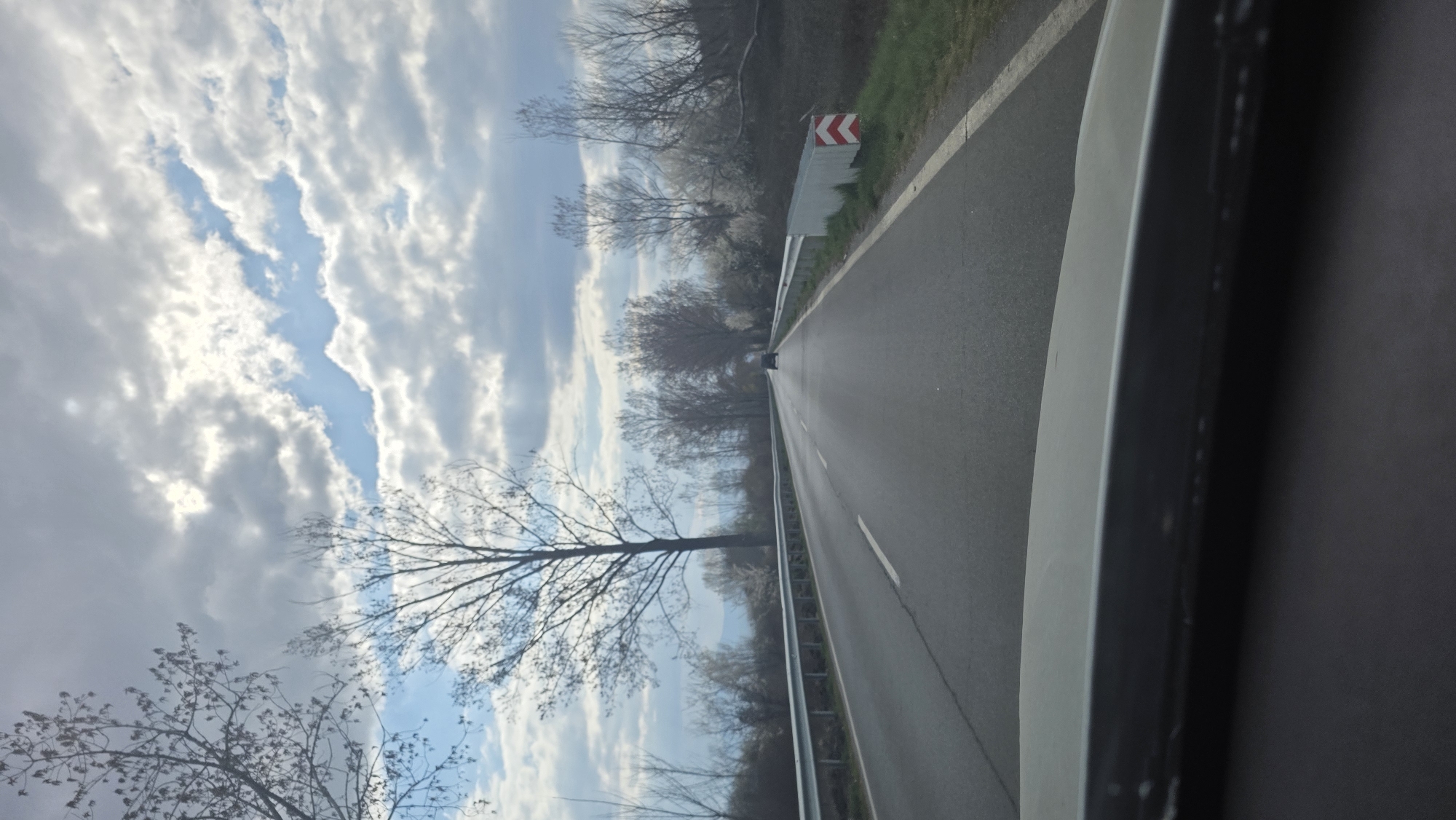 The image presents a forward-facing view from inside a vehicle traveling on an asphalt road in Kocherinovo, Bulgaria. The sky above is partially overcast with large white and gray cumulus clouds, interspersed with clear blue patches where sunlight is visible. The road is a two-lane path with a dashed white center line and a solid white line marking the right shoulder. Metal guardrails run parallel to the road on both sides, receding into the distance. The surrounding environment consists of dormant deciduous trees, some with visible buds or early catkins, suggesting a late winter or early spring season. Notably, some trees on the right exhibit white blossoms. Green grass lines the road shoulders. In the far distance, a dark-colored vehicle is visible, proceeding away from the viewer. A white rectangular road marker with red and white chevron stripes is positioned on the right side of the road, near the guardrail. The bottom edge of the frame reveals the dark gray dashboard or upper interior of the vehicle from which the photograph was taken.
