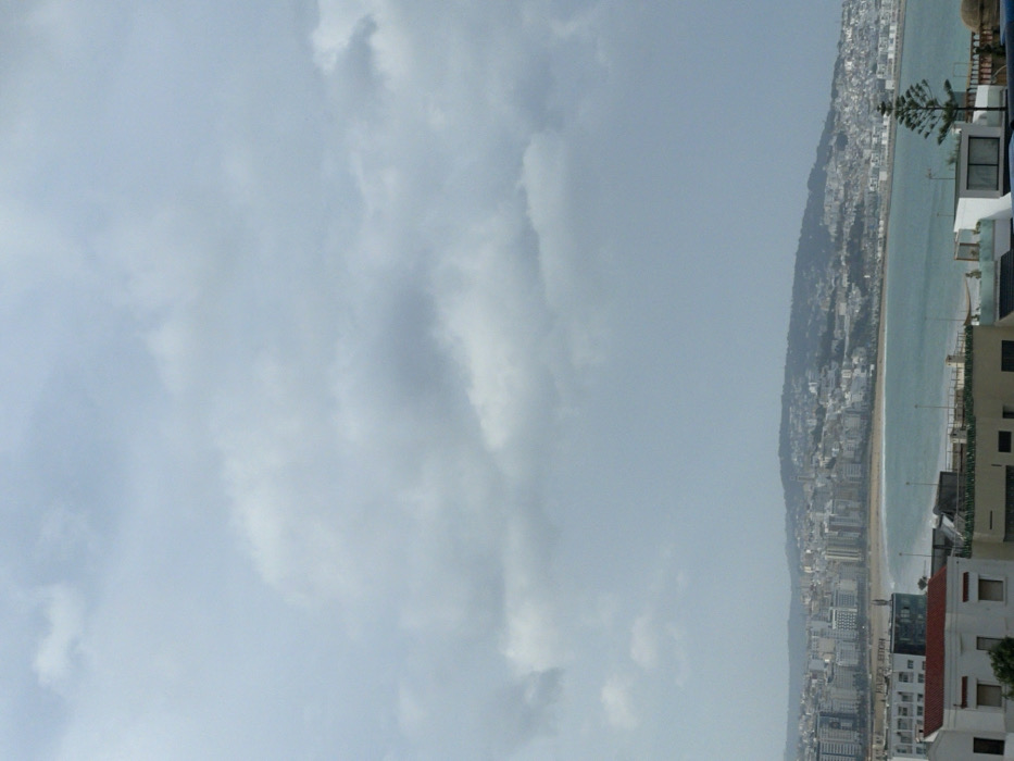 A cityscape hugs a coastline beneath a cloudy sky. Tall buildings cluster along the shore, receding into the distance. The sea stretches parallel to the urban development, its color mirroring the overcast sky. A few palm trees punctuate the buildings, adding a touch of greenery to the scene. The image is slightly tilted, giving a sense of looking down from a high vantage point.
