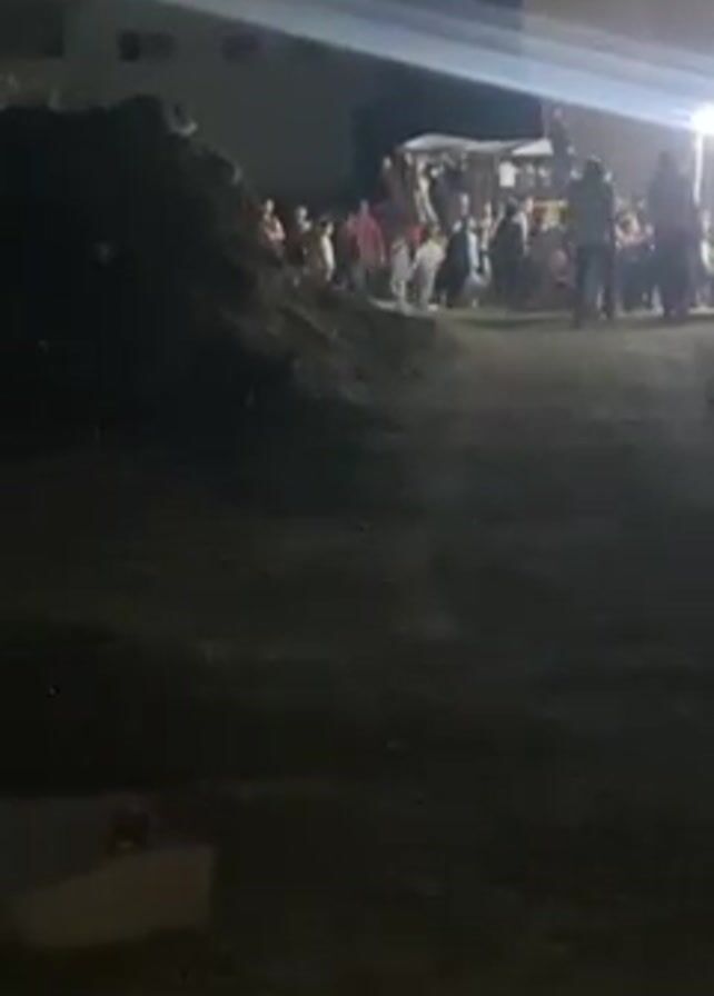 group of people gathered outdoors at night. The scene is illuminated by a bright overhead light. The group appears to be standing on a slight incline, with a pile of dirt or debris in the foreground. A building is visible in the background. It is difficult to discern the specifics of the people or their actions due to the distance and darkness, but they seem to be interacting and standing together.