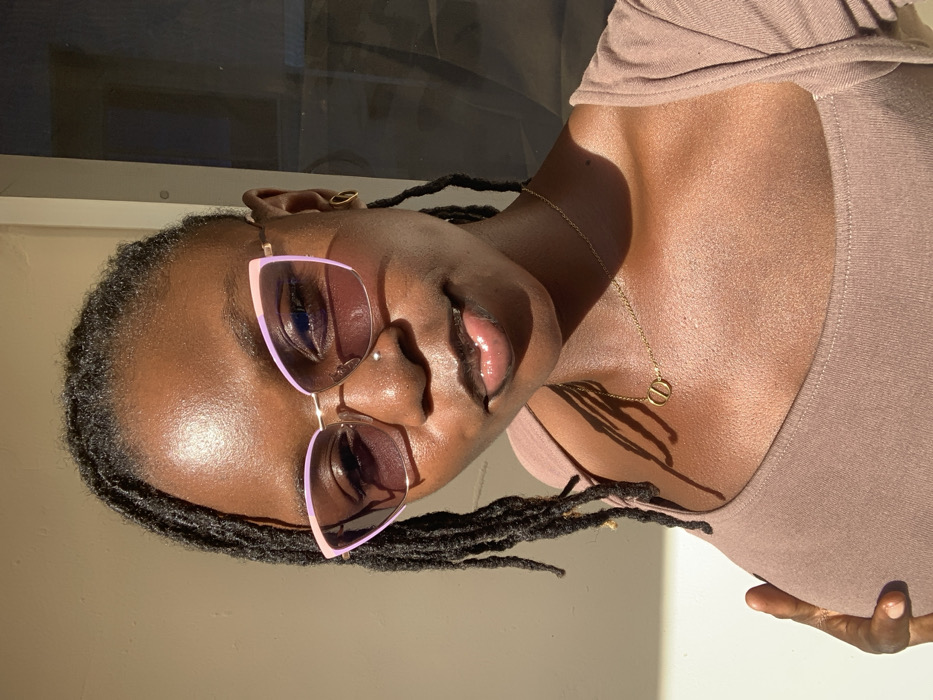 A chest-up portrait shows a female individual in Tempure, Nigeria. The subject has dark skin, with dreadlocks partially visible on her head and shoulders. She is wearing pink cat-eye sunglasses with dark lenses and a silver stud nose piercing. A gold chain necklace with a 'CD' pendant is visible around her neck, and a gold teardrop-shaped earring is present in her right ear. Her lips are glossy and slightly parted. She is dressed in a light brown, possibly mauve, scoop-neck top. Strong, direct sunlight illuminates the subject from the right, creating prominent highlights on her skin and reflections on the sunglasses. The background on the left consists of a plain, light-colored wall, while the right side shows a darker, reflective surface, likely a window. The individual is looking directly towards the viewer.