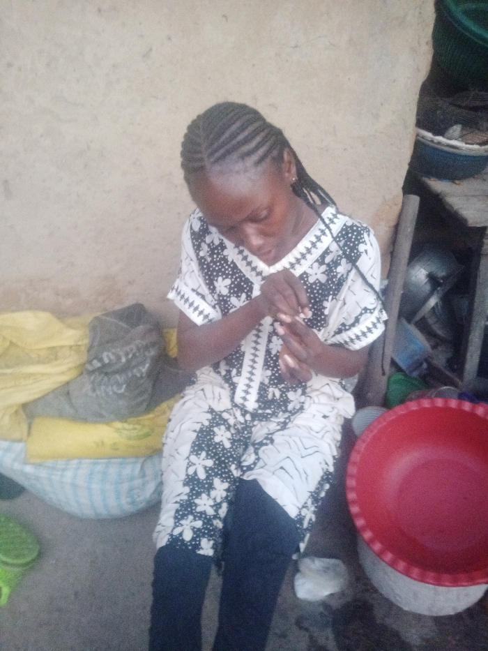 A woman with braided hair sits and appears to be focused on something held in her hands. She wears a patterned black and white dress over black pants. Next to her are a gray boot, a yellow bag, and a red bowl. The backdrop is a beige wall. The overall setting suggests a simple, possibly outdoor or semi-outdoor, environment.