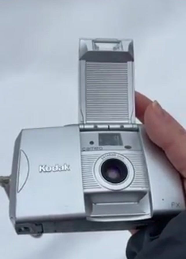 A hand closes the flash on a Kodak Cameo FX camera. The camera is silver and has the words "Kodak" and "Cameo" on it. The background is a white, snow-covered surface. The hand is wearing a dark jacket. The camera strap is visible.