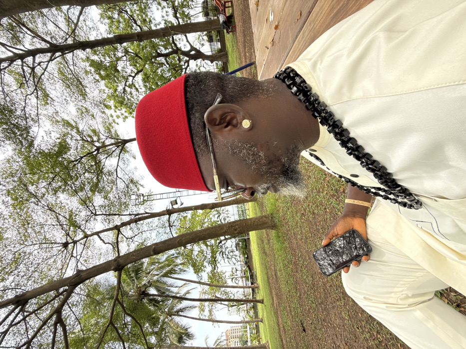 An adult male with dark skin, grey and black hair, and a beard is seated outdoors in Itirin, Nigeria, in a side profile facing left. He wears a red, flat-topped hat, gold-framed glasses, and a gold stud earring. His attire includes a cream-colored traditional garment with matching trousers, multiple strands of black cubic-shaped beaded necklaces, and a gold bracelet on his right wrist. He holds a black smartphone with a dark, reflective screen in his right hand. The background features a park-like setting with numerous trees, including palm trees, green grass, a tall metallic pole, and distant multi-story buildings. A dark fence and a wooden bench are also visible.