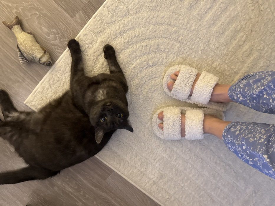 This image captures an indoor scene in Sosnovoborsk, Russia, presented from an overhead perspective. In the foreground, a person's feet, clad in white, fluffy, two-strap slippers and light blue trousers with a white floral pattern, are positioned on a light-colored, textured rug. Towards the upper mid-ground, a dark grey cat with prominent yellow-green eyes lies on its back or side on the rug, its head turned to face the viewer directly. Its body partially extends onto a light wooden plank floor visible adjacent to the rug. A beige, fish-shaped cat toy rests on this wooden flooring, situated to the upper right of the cat.