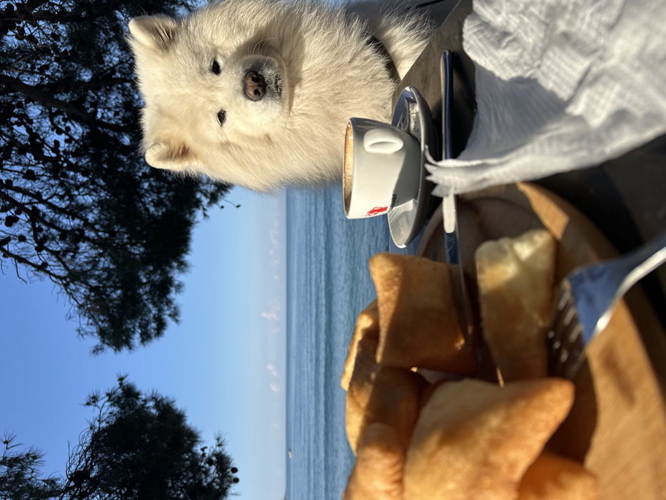 The scene depicts an outdoor breakfast or coffee setting in Bar, Montenegro, on a clear, sunny day. In the foreground, a dark table holds a wooden plate with several golden-brown, irregularly shaped fried dough items. A silver fork is visible on the plate. To the right of the plate, a white ceramic espresso cup with a red logo rests on a matching saucer, containing a partially consumed coffee beverage. A small white packet and a silver utensil are present on the saucer and table, respectively, alongside a crumpled white napkin. A large, fluffy white Samoyed dog occupies the right side of the frame, positioned as if seated at the table, looking directly towards the viewer. A dark harness is visible on the dog's chest. The background features a calm, blue sea with subtle ripples, extending to the horizon under a clear blue sky with faint, distant cloud formations. A small boat is visible on the water in the middle distance to the left. The top of the frame is bordered by the dark, silhouetted branches of pine trees.