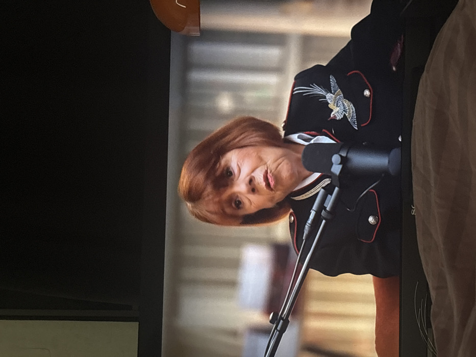 - "The scene depicts an elderly woman with reddish-brown, chin-length hair, positioned centrally and speaking into a black microphone" by FM-0FokE2, licensed under CC BY 4.0
