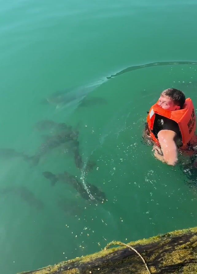 A man in the water, wearing an orange life vest, throws pieces of food into the water. Several large fish swim to the food and eat it. The water is green and clear. The man is swimming near a wooden dock or log. The weather appears sunny and clear.