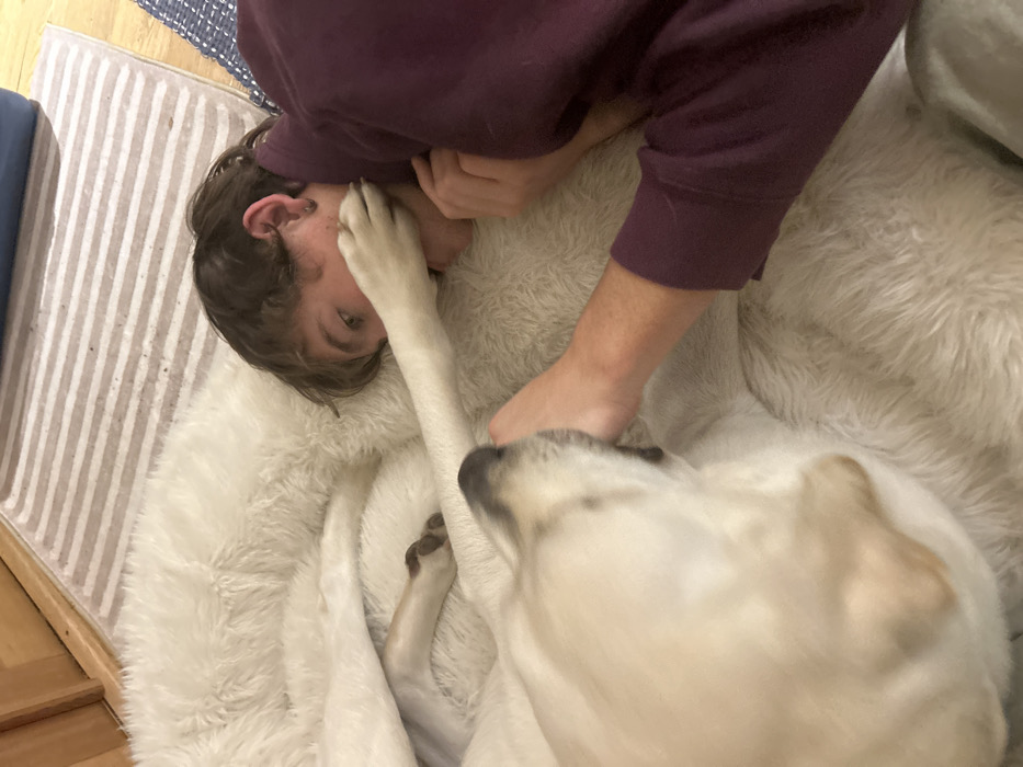 An indoor scene in Squamish, Canada, captures a young individual lying on a white shag rug, surrounded by two dogs