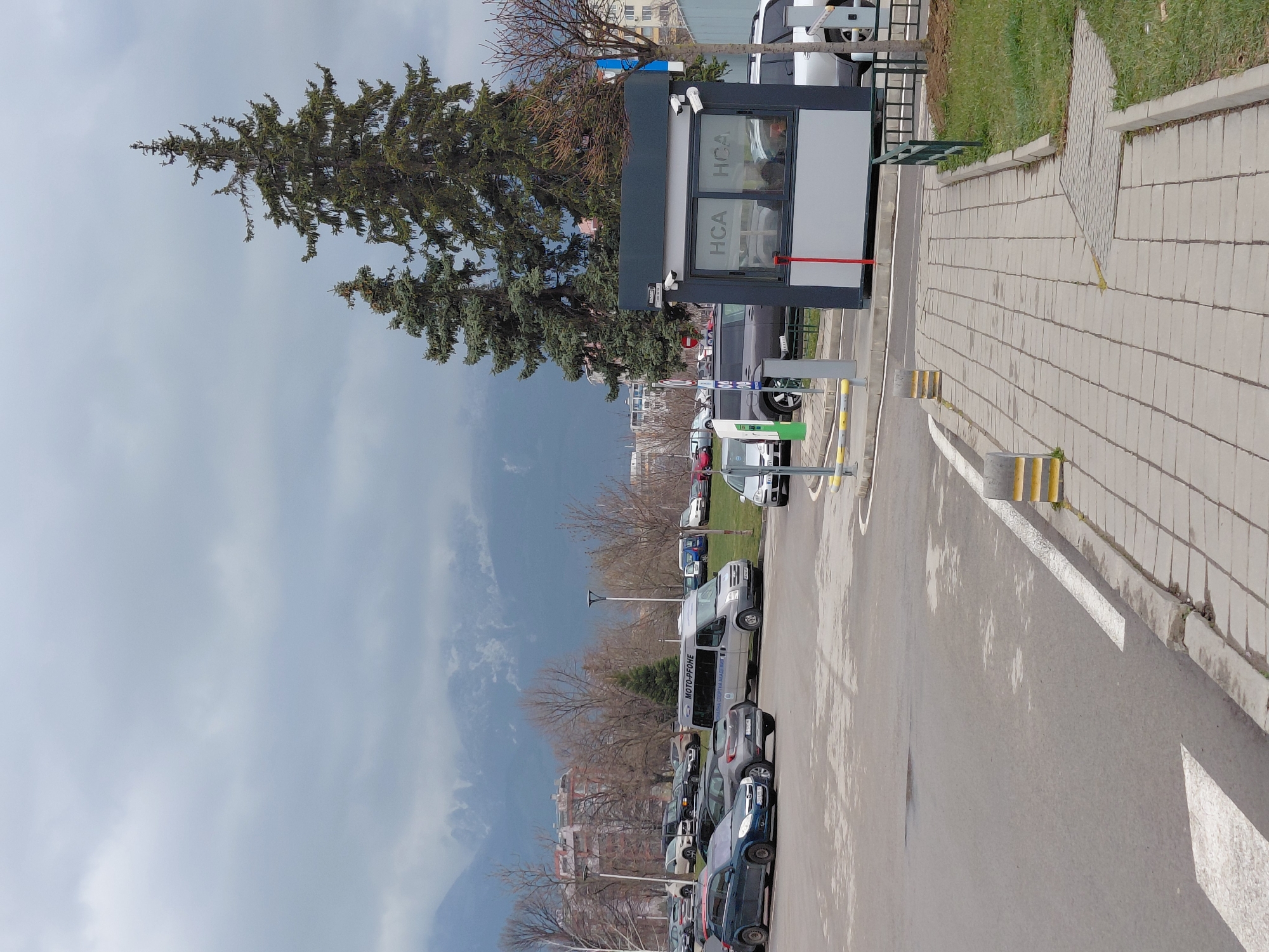 The image depicts an outdoor parking lot at the foot of Vitosha Mountain in Sofia, Bulgaria, likely near the National Sports Academy "Vassil Levski" in the Studentski Grad district. The sky is overcast and grey. In the mid-ground, a large asphalt parking area holds numerous vehicles. A silver Ford Transit van, prominently displaying "MOTO-PFOHE" and "ОБЩИНА СПОРТНА АКАДЕМИЯ" (MUNICIPALITY SPORTS ACADEMY) on its side, is parked facing left. Other vehicles include a dark blue hatchback (likely an Opel Astra H) in the left foreground, a grey hatchback (likely a Renault Megane) behind it, and various sedans and SUVs parked across the lot. The asphalt shows signs of wear and faint white parking lines. To the right, a dark grey security booth with "HCA" branding on its windows marks an entrance or exit point. Two black surveillance cameras are mounted on the booth's front corners. A red and white barrier arm is visible to the left of the booth. Inside the booth, a person is partially visible, facing left. Adjacent to the booth on the right is a paved pedestrian sidewalk made of grey square tiles, bordered by a grass strip and yellow and grey striped bollards. Two tall, dark green coniferous trees stand behind the booth, dominating the right side of the frame. Scattered bare deciduous trees are visible throughout the mid-ground and background, indicating a non-summer season. Several multi-story residential or administrative buildings are discernible in the distance, nestled between the bare trees and the base of the snow-capped Vitosha Mountain, which is partially obscured by low-hanging clouds. No active interactions are occurring; the scene is static.