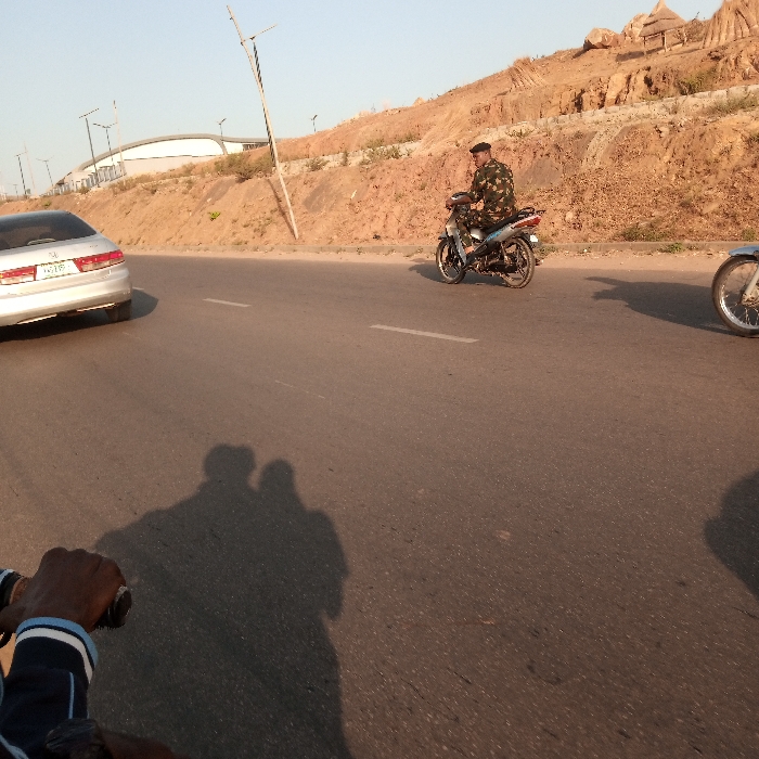 A silver car is on the left side of the road. In the center, a person in military fatigues rides a small motorcycle. Another motorcycle is partially visible on the right edge. The road is paved and has white lane markings. A hill is in the background, with a building and structures on top. The shadows of two people, possibly on a bicycle, are prominent in the foreground, suggesting the photo was taken by one of them.