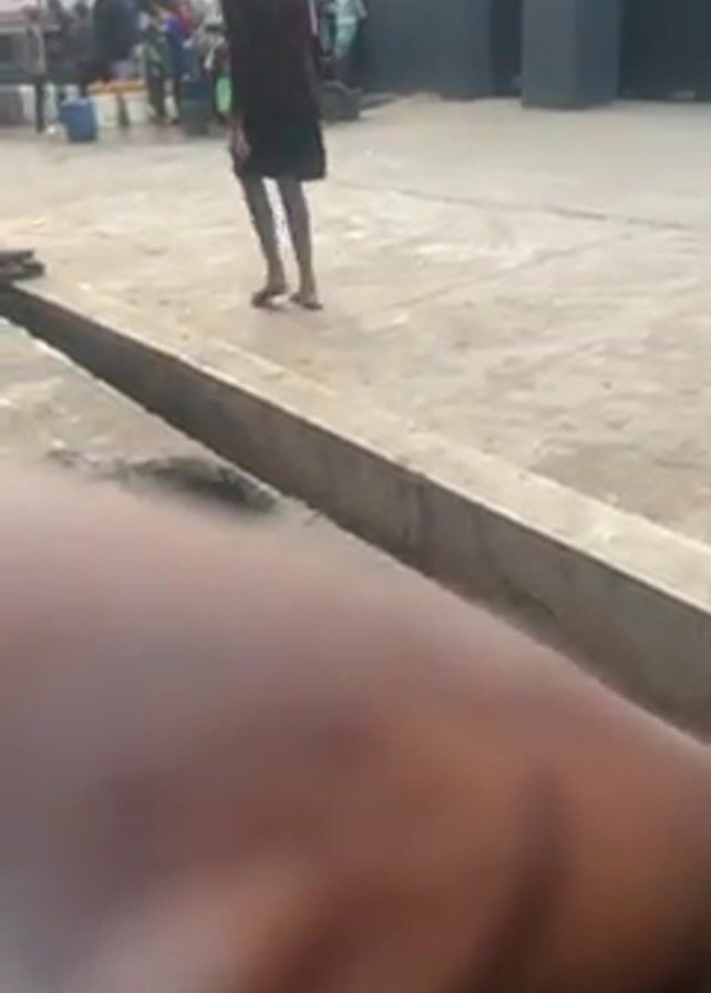 courtyard area with a group of people in the background. A person wearing shorts and a long-sleeved shirt walks away from the camera towards the group. There is a concrete barrier or curb in the foreground, partially obscuring the view. The ground is concrete. The lighting is somewhat overcast.