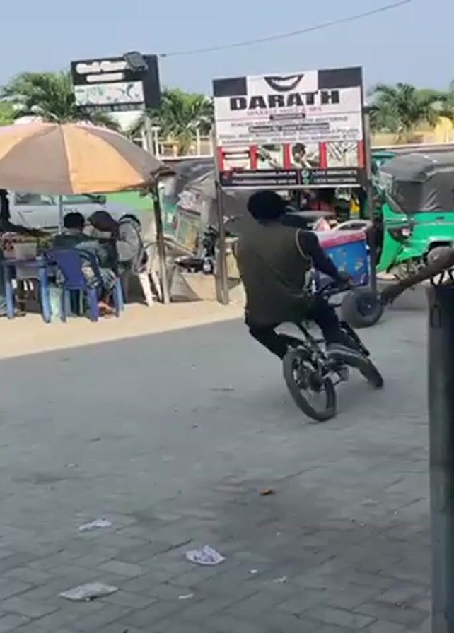 man riding a bicycle in an outdoor area with businesses and vehicles. The man is wearing a tank top and dark pants and appears to be struggling to control the bicycle, which is small and may have modified features. He is making several turns and appearing unsteady. In the background, there are people standing near a vehicle and under an umbrella. There are signs for businesses such as Darath and others that are partly obscured. The area looks like a busy street or market place.