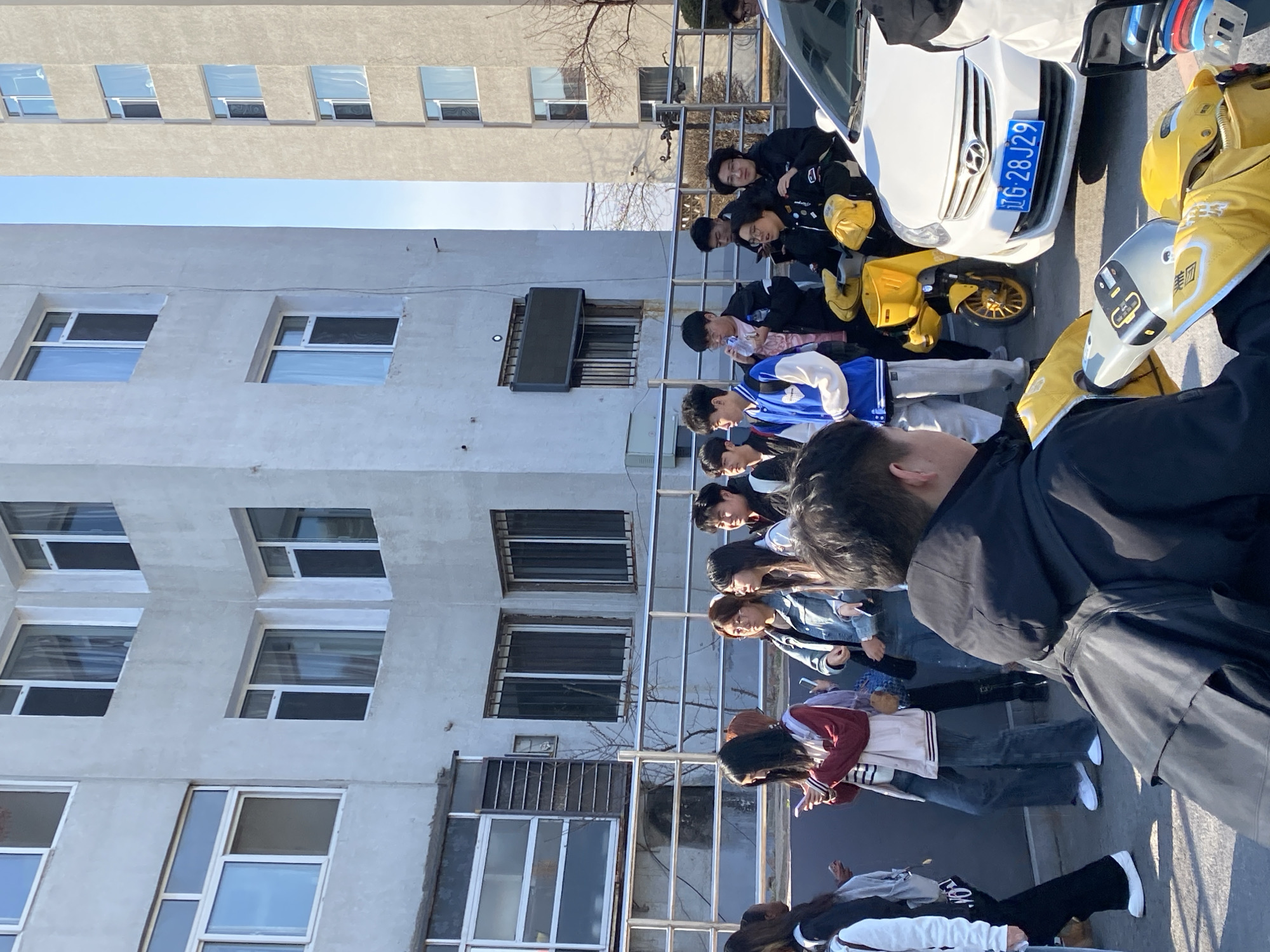 A group of people are lined up outdoors next to a building, a car, and yellow scooters. The building is tall with many windows. The car is white with a license plate that reads "冀G·28J29". Some of the scooters are yellow. The location is Zhongtun, China.