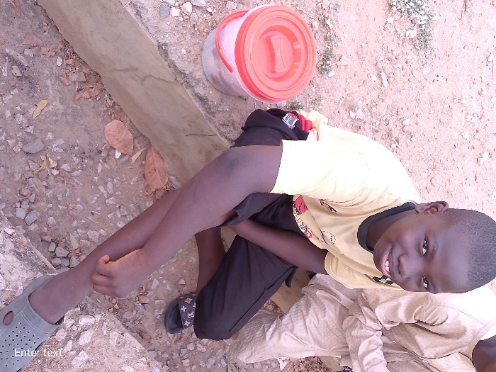 The scene depicts a young male individual seated or squatting outdoors in Adankolo, Nigeria
